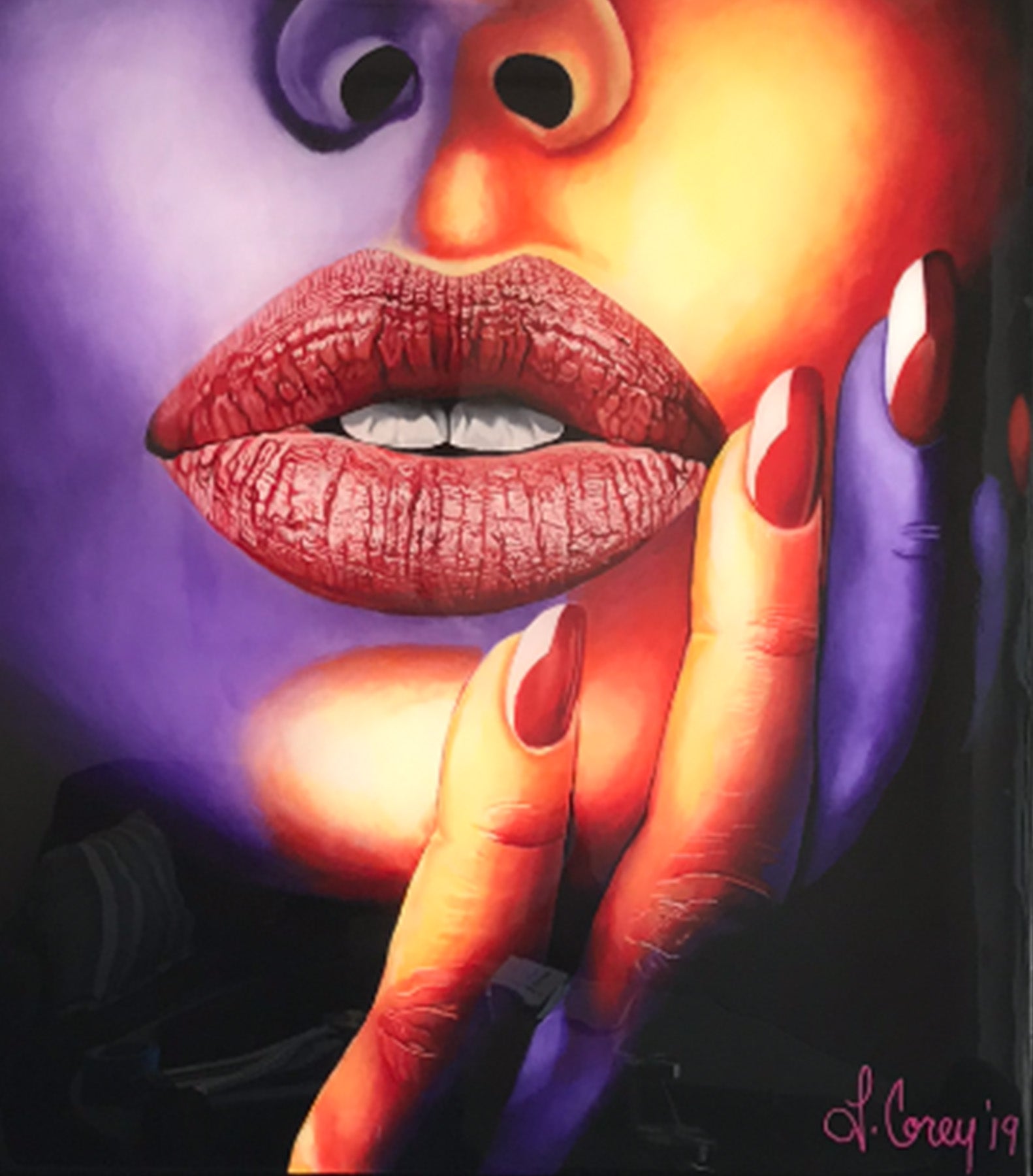 This original painting is done with acrylic on canvas. Size 48x36”. Coated with art resin in a Custom floating black frame. Created 2019.